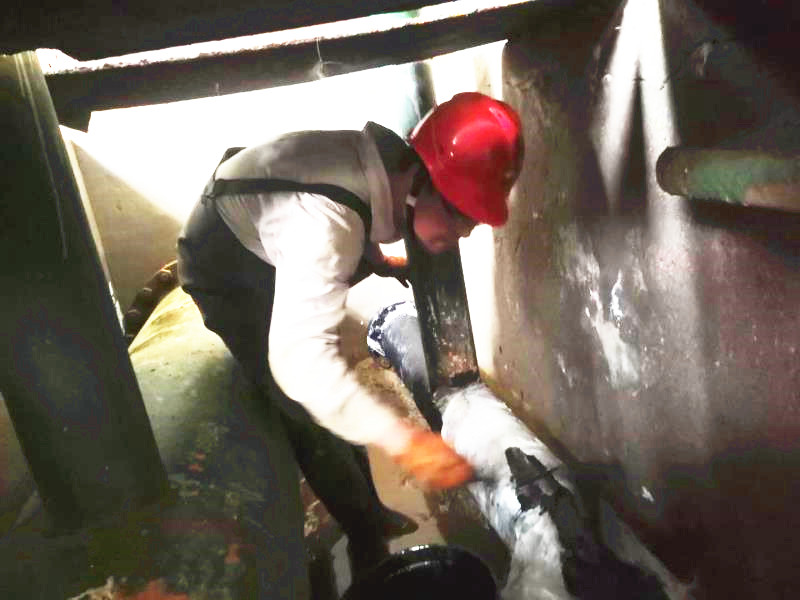 原鹵管線是采鹵崗位重要的組成部分,是停車必檢項(xiàng)之一。但是檢修難度不小,一是過(guò)道空間狹小,光線昏暗,一次僅夠兩個(gè)人同時(shí)作業(yè);二是檢修原鹵管線時(shí),必須“涉水”作業(yè)。檢修期間原鹵管線一閃一閃的焊光將周圍照亮,順著火花向里看去,只見有兩個(gè)人在狹小的空間綣著身子低頭忙活著,感覺(jué)身子都轉(zhuǎn)不開的樣子。他們像小貓似的蜷縮在兩邊,全身濕透,白色的工服也被銹漬染的亂起八糟,被油漬沁透成一坨一坨的,但他們堅(jiān)定的眼神、專注的神情卻叫人佩服。我不禁問(wèn)道:“這么窄的空間人咋進(jìn)去啊?”他們開玩笑的說(shuō):“用縮骨功啊!”
