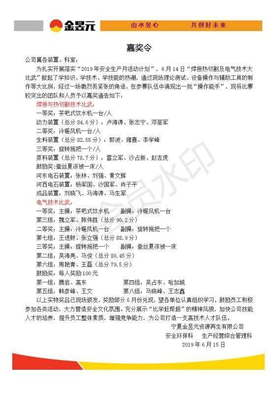 比賽結(jié)束后,公司對(duì)此次參加比賽的所有人員頒布了嘉獎(jiǎng)令,鼓勵(lì)員工在今后的工作中提高操作水平,努力奮進(jìn),爭(zhēng)做優(yōu)秀員工!