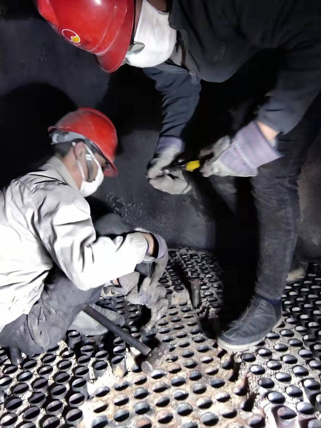 而另一邊,脫硫塔底積料清理卻迎上了這寒冬的冷意,塔里潮濕又冷,光線又黑暗,與塔外的氣候可以說是“有過之而無不及”。塔底的積水沒過膝蓋,從外向里望去就像個黑乎乎的“水缸”,只見我們檢修人員二話不說穿上雨鞋,冒著塔里零下五六度的低溫鉆進去開始工作,塔內淤泥被他們用鐵鍬不斷鏟向外面,從塔內出來的時候衣服已經濕了半截凍得瑟瑟發抖,可是沒有半點怨言,而主人翁的能動性和著齊心協力描繪出了冬日里一道充滿暖意的風景!