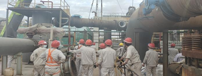 第一天氯乙烯裝置迅速拉開檢修戰,先是對水堿洗組合塔進、出管口線漏點進行消除,安排吊車及相關人員在場,辦證,拆除管節前的準備工作做好后立即組織人員開始卸閥門,在檢修工和吊車的完美配合下,漏點的管節拆除完成,后安排生產科主管去平羅襯塑。另外一邊精餾場地也是熱鬧非凡,檢修工作雖然忙碌但不盲目,人員拆除,你卸閥門,他焊缺口,我高空作業,吊車協助拆卸高低塔塔盤篩網,安全著陸后立即組織人員進行清洗,清洗完成后又組織安裝,一切如行云流水,維修工熟悉的手法給安全檢修及順利開車又加了一道保險。混合脫水管線技改是片區及集團公司領導關注的重點,此次檢修,管線碰口,也是尤為重要,在相關技術人員及維修工的協作下,做了氣相預留口,為后期混合脫水項目開車平穩運行埋下了伏筆。
