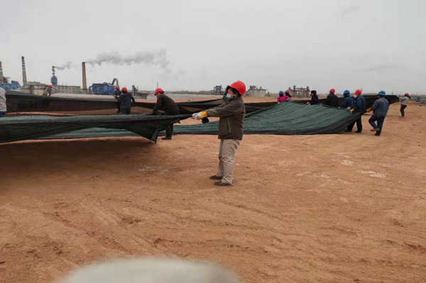 由于公司電石泥堆場地更換為新原料堆場造成的部分土地裸露,造成揚塵污染,治風沙、阻揚塵這項工作迫在眉睫;初冬的天氣冷風呼啦啦掃動著滿地的枯葉紙屑,濃黑的云像一團團破絮,倒懸在我們的上空,北風呼呼那個吹,任憑它的怎么肆虐卻擊退不了職工們工作的熱情,瞧他們單膝蓋在潮濕的泥土上細心的用鐵絲鏈接著每個接口。男職工展現(xiàn)大力水手的魅力,兩人一卷,一人一卷有序的擺放在裸露的土地中央,女同事也不甘示弱拆開整卷防塵網整齊的鋪在砂石頂部,大家喊著整齊的口號,經過一早上不懈努力,就將整個原料場地覆蓋完畢。既抑制滿天風沙的場景,也保存了大量的原料被風帶走,造成原料損耗。