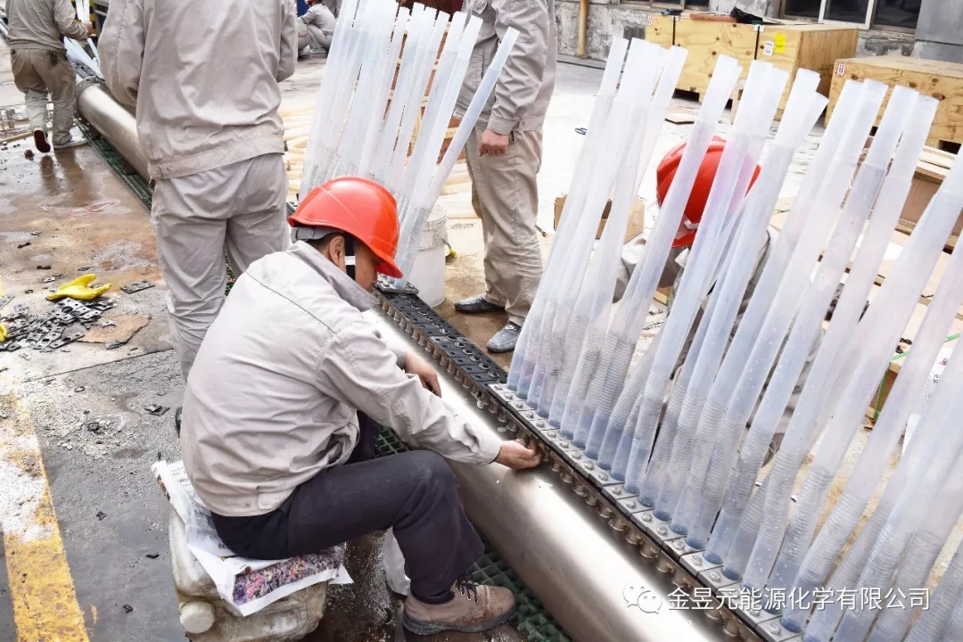 離子膜裝置B槽檢修作業現場,裝置將去年A槽檢修換膜總結的經驗和方法充分運用到此次作業中,同時裝置檢修人員積極與廠家技術人員在鏟膠、貼膠、貼膜等作業方法和技術上進行廣泛的交流學習,有效加快了檢修進度。