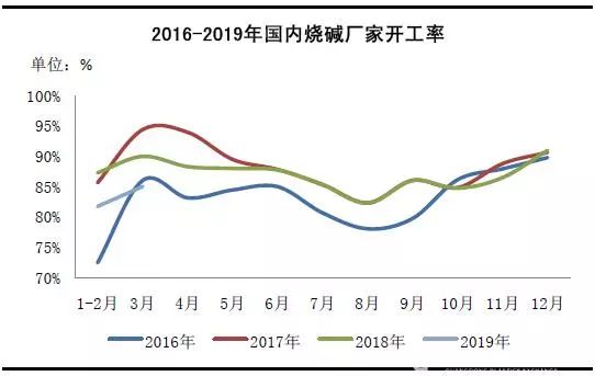 圖2 2016-2019年國(guó)內(nèi)燒堿廠家開工率