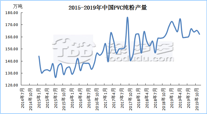 2019年1-11月PVC累計產量1816.75萬噸,同比去年減少92.79噸。漲幅5.38%,產能的凈增是產量增加的主要原因。