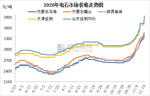 整體市場描述:上周五至今電石價格繼續(xù)快速上漲,各地采購價連續(xù)上調(diào)300-400元/噸,電石出廠價上調(diào)200元/噸左右,且烏海及周邊貿(mào)易出廠價推出了明日繼續(xù)上漲100元/噸計劃。至此,10月下旬至今,電石價格已連續(xù)上調(diào)了700-800元/噸,達(dá)到2011年9月以來的最高水平。本周電石價格仍在繼續(xù)上調(diào),主要仍因供需失衡,貨源緊俏推動。內(nèi)蒙古地區(qū)電石仍頻繁有不同程度的限電現(xiàn)象,產(chǎn)量不足,寧夏石嘴山地區(qū)受重污染天氣影響,本周后期有電石爐降負(fù)荷現(xiàn)象,外加其它復(fù)工電石爐恢復(fù)緩慢,電石增量較為有限;但PVC價格仍在連續(xù)上漲,前期停車PVC企業(yè)也有復(fù)產(chǎn),整體開工高位,部分甚至超負(fù)荷運(yùn)行,外加冬季來臨前對電石也有補(bǔ)庫需求,整體需求維持高位,綜合導(dǎo)致電石貨源持續(xù)緊張,價格得以連續(xù)上揚(yáng)。